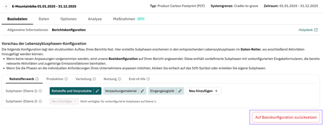 Die Konfiguration der Subphasen erfolgt zentral in den Basisdaten des PCF-Berichts im Bereich Berichtskonfiguration. Dort legen Sie fest, welche Subphasen innerhalb der einzelnen Lebenszyklusphasen existieren sollen.