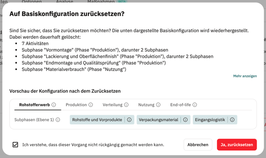 Beim Zurücksetzen auf die Basiskonfiguration werden alle benutzerdefinierten Subphasen sowie sämtliche darin enthaltenen untergeordneten Subphasen und Aktivitäten vollständig gelöscht. Das Zurücksetzen kann nicht rückgängig gemacht werden.