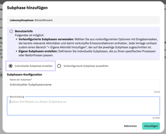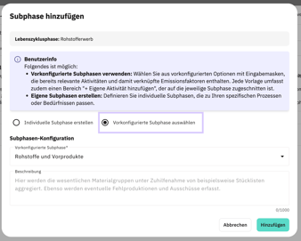 Subphasen auf Ebene 1 definieren dabei die Hauptstruktur innerhalb einer Lebenszyklusphase. Dabei können entweder vorkonfigurierte Subphasen verwendet werden, die bereits vordefinierte Aktivitäten und damit verknüpfte Emissionsfaktoren enthalten. Dies unterstützt besonders zu Beginn bei der Datenerfassung. Alternativ können individuelle Subphasen genutzt werden, die frei benennbar sind und unternehmensspezifische Prozessschritte abbilden.