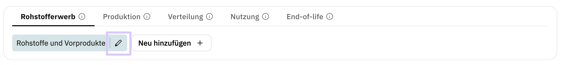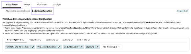 Mit der Berichtskonfiguration wird der strukturelle Aufbau eines Product Carbon Footprints flexibel an die realen Prozesse des Unternehmens angepasst. Die definierten Subphasen bestimmen, wo Aktivitäten im Daten-Reiter erfasst werden und wie diese anschließend im Analyse-Bereich dargestellt werden.