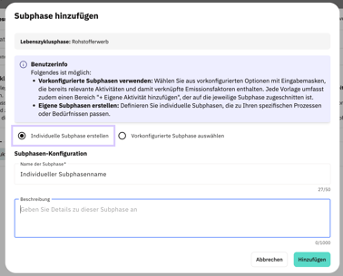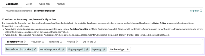 Die Konfiguration der Subphasen erfolgt zentral in den Basisdaten des PCF-Berichts. Dort wird festgelegt, welche Subphasen in den einzelnen Lebenszyklusphasen existieren sollen. Diese Struktur wird im Reiter Daten automatisch übernommen und bildet die Grundlage für die anschließende Erfassung von Aktivitäten.