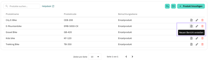 Alternativ kann ein neuer PCF-Bericht auch direkt aus der Produktliste angelegt werden. Klicken Sie dazu in der jeweiligen Produktzeile auf den Button Neuen Bericht erstellen. Sie gelangen anschließend direkt zur Eingabemaske für einen neuen Bericht. Das ausgewählte Produkt sowie der Berichtstyp Product Carbon Footprint (PCF) sind dabei bereits vorausgefüllt. Dadurch lassen sich neue Berichte schneller und mit weniger manuellen Eingaben anlegen.