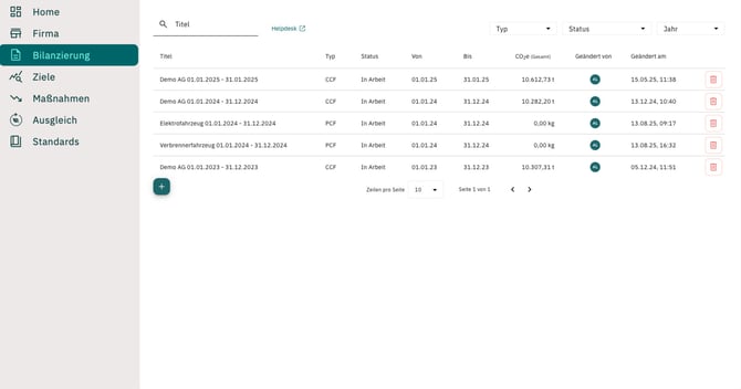 Im Reiter Bilanzierung in der linken Navigationsleiste können neue Berichte zur Emissionsberechnung eines PCFs anlegt sowie bestehende Berichte eingesehen und bearbeiten werden.