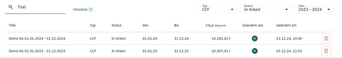 Um gezielt nach bestimmten Berichten zu suchen, stehen die drei Filter Typ, Status und Jahr zur Verfügung. Der Filter Typ ermöglicht nach Corporate Carbon Footprint (CCF), Event Carbon Footprint (ECF) oder Product Carbon Footprint (PCF) Berichten zu suchen. Mit dem Filter Status können Sie nach Berichten suchen, die In Arbeit, In Prüfung, Freigegeben oder Veröffentlicht sind. Über den Filter Jahr können Sie den Berichtszeitraum eingrenzen, in dem Sie in der Jahresübersicht entweder doppelt auf ein Jahr klicken oder zwei verschiedene Jahre auswählen. Nach dem Setzen der Filter werden nur noch Berichte angezeigt, die den gewählten Kriterien entsprechen.