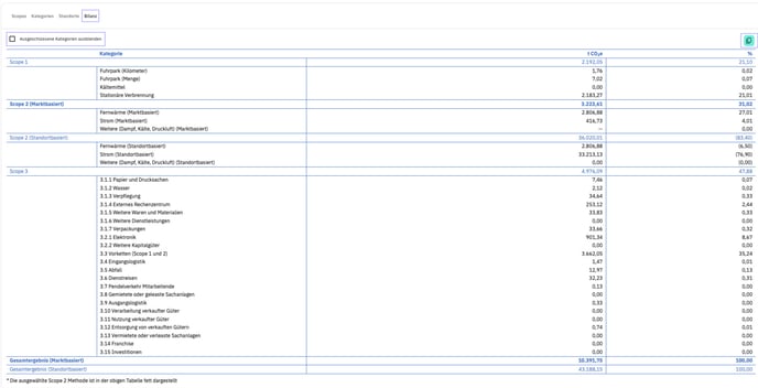 Über den Reiter Bilanz kann das Unternehmen seine Emissionsbilanz einsehen, in der die Emissionen je Kategorie dargestellt und zu den einzelnen Scopes aufsummiert werden. Für die Scope-2-Emissionen und die Gesamtemissionen werden sowohl die markt- als auch die standortbasierten Emissionen berechnet. Der fett markierte Ansatz - hier marktbasiert - entspricht dabei dem vom Unternehmen ausgewähltem Ansatz.