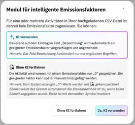 Nach erfolgreichem Upload verknüpft die KI automatisch passende Emissionsfaktoren mit den Aktivitäten im Climate Hub. KI-Vorschläge sind durch diesen Button gekennzeichnet:![]()