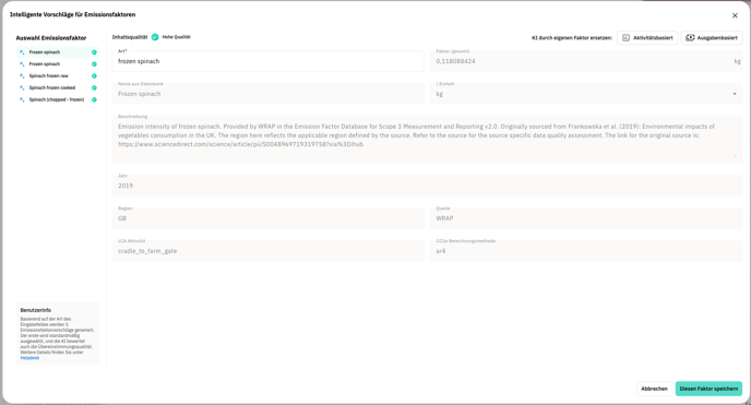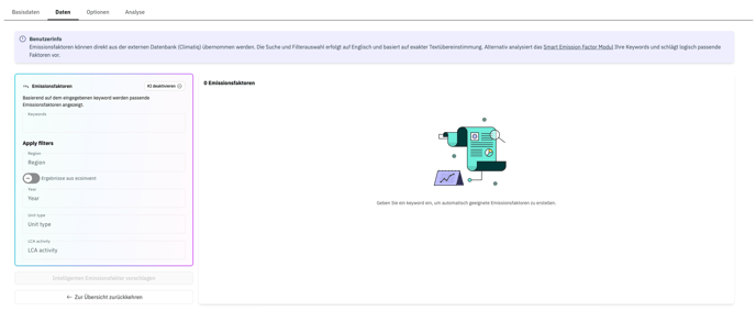 - KI-gestützt automatisch mit einem passenden Emissionsfaktor verknüpfen.