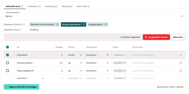 Nach dem Löschen werden die betroffenen Emissionswerte aus der PCF-Berechnung entfernt. Die betroffene Phase bzw. Subphase sowie aggregierte Emissionswerte werden automatisch neu berechnet.