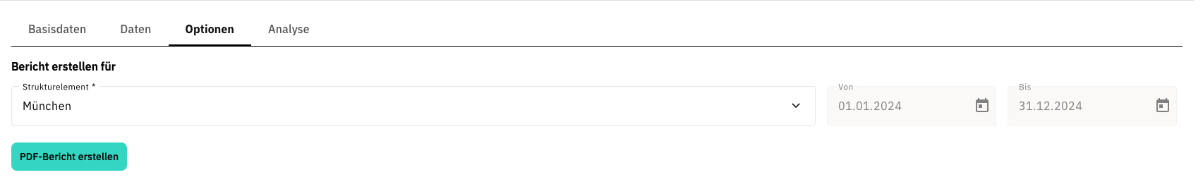Im Reiter Optionen kann über den Button PDF-Bericht erstellen automatisch ein PDF-Bericht zu Ihrem PCF erstellen werden.