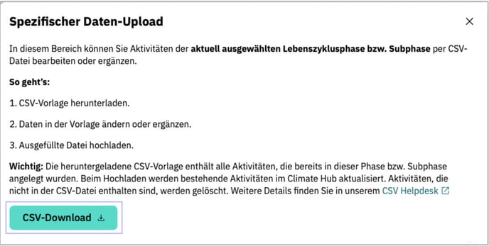 Klicken Sie zunächst auf den Button Spezifischer Daten-Upload in der Lebenszyklusphase oder Subphase, in der Sie Aktivitäten hochladen möchten. Es öffnet sich ein Popup-Fenster. Klicken Sie hier auf den Button CSV-Download, um die von uns bereitgestellte CSV-Vorlage herunterzuladen.