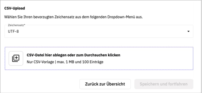 Sobald Ihre CSV-Datei vollständig ausgefüllt ist, können Sie das Popup-Fenster Spezifischer Daten-Upload erneut öffnen. Über das Dropdown-Menü Zeichensatz können Sie zwischen verschiedenen Zeichensätzen wählen und anschließend die Datei über Durchsuchen hochladen.
