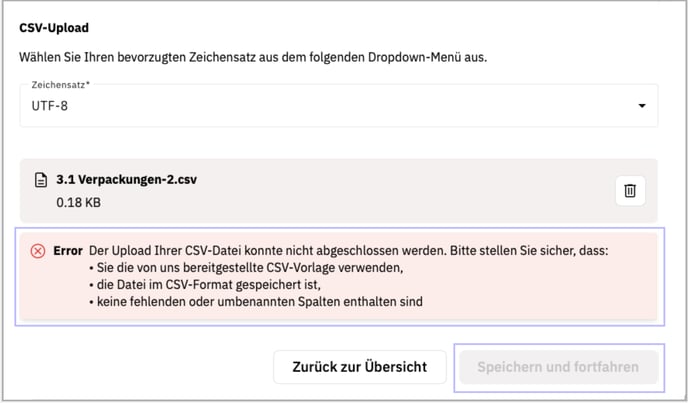 Kam es stattdessen zu einem Fehler beim Upload, so ist eine rote Fehlermeldung sichtbar. Der Button Speichern und Weiter ist deaktiviert bis die Fehler behoben wurden (siehe Punkt 4).