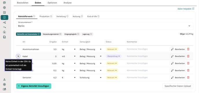 Es muss exakt dieselbe Einheit verwendet werden wie bei der Einheit des Emissionsfaktors. (Beispiel: Wenn der Wert als Anzahl angegeben ist, muss auch die Einheit des Emissionsfaktors Anzahl lauten.) - Wenn die Einheit und die Emissionsfaktor Einheit in der CSV nicht ausgefüllt wurden, werden beide Felder automatisch mit "m3" vorgelegt. Ein entsprechender Hinweis wird über ein graues Icon, auf dem ein Dokument und ein Ausrufezeichen abgebildet ist, am Anfang der Aktivitätszeile sichtbar. Die korrekte Einheit kann später manuell über das System nachgetragen werden.