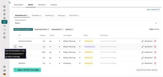 - Kabel: Es wurde noch kein Emissionsfaktor eingegeben. Beim Hochladen wird der Aktivität daher ein Emissionsfaktor von Null zugewiesen. Der Faktor kann später über das System hinzugefügt werden.
