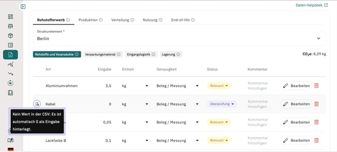 - Lackfarbe A: Hierbei handelt es sich um einen PCF eines Lieferanten, der in die Spalten Emissionsfaktor und Emissionsfaktoreinheit eingegeben wird (2,3 kg/kg). Die gekaufte Menge des Materials wird in die Spalten Wert und Einheit eingegeben (0,05 kg).