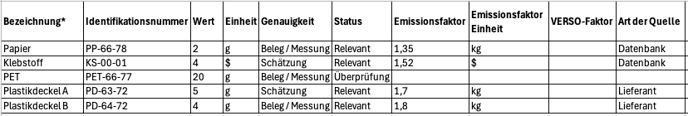 - Kunststoffdeckel A: Hierbei handelt es sich um einen PCF eines Lieferanten, der in die Spalten Emissionsfaktor und Emissionsfaktoreinheit eingegeben wird (1,7 kg/kg). Die gekaufte Menge des Materials wird in die Spalten Wert und Einheit eingegeben (5 g).