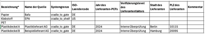 - Jahr des Lieferanten-PCFs (optional, max. 4 Zeichen):