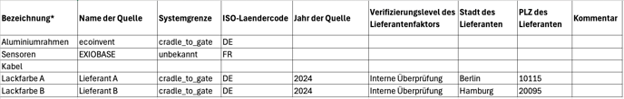 In dieser Spalte kann angegeben werden, ob der Emissionsfaktor des Lieferanten verifiziert wurde und ob diese Verifizierung intern oder extern stattgefunden hat. Verwenden Sie bei der Angabe ausschließlich eine der folgenden Auswahlmöglichkeiten:-