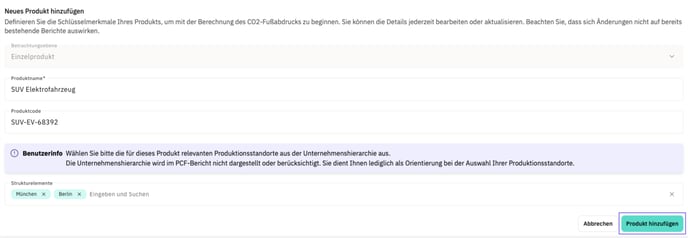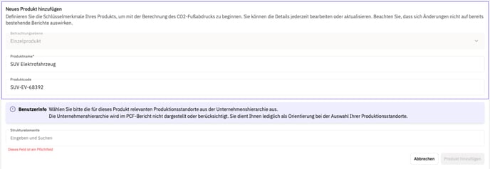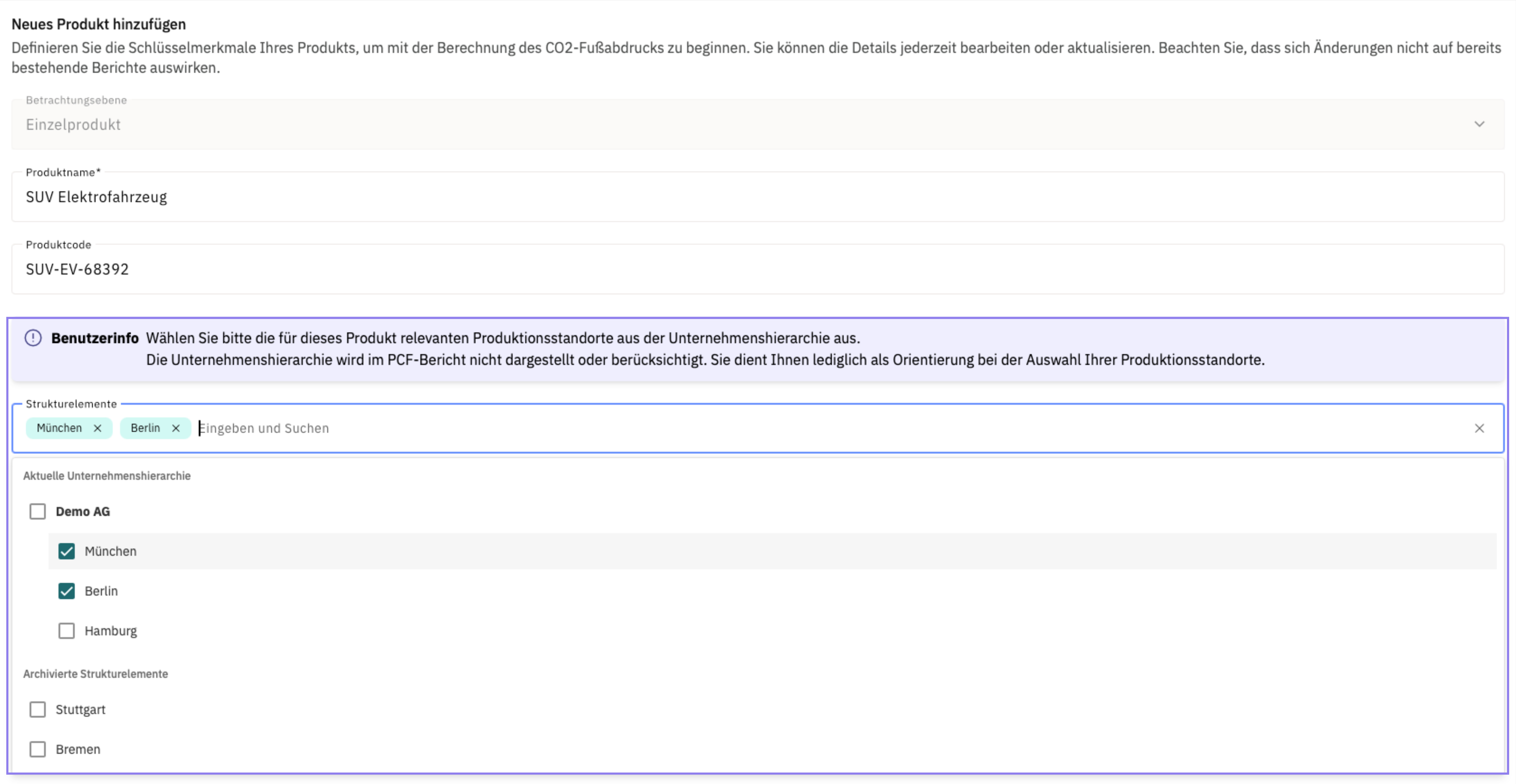 Im Weiteren erfolgt beim Anlegen eines Produktes auch die Zuweisung der zugehörigen Produktionsstandorte über das Dropdown-Menü Strukturelement. Hier wird die im Reiter Firma angelegte Unternehmenshierarchie angezeigt. Durch das Anwählen der Checkboxen können Sie festlegen, an welchen der Standorte das zu bilanzierende Produkt hergestellt wird. Die gewählten Standorte werden automatisch in die PCF-Berichte zu diesem Produkt übernommen.