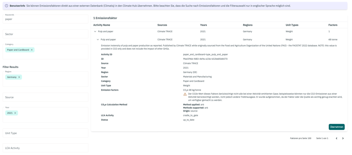 Wenn Sie einen passenden Faktor gefunden haben, können Sie diesen durch Klicken auf den Button Übernehmen in den Climate Hub übernehmen. Alle relevanten Infos, die für die Nachvollziehbarkeit wichtig sind, werden anschließend im Climate Hub angezeigt. Dort haben Sie auch die Möglichkeit der Aktivität einen eigenen Namen (Art) zu geben.