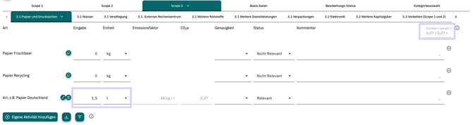 Durch das Klicken des Häkchens erscheint die Aktivität in der Übersicht und das Unternehmen kann seine Vebrauchswerte in der Spalte Eingabe eintragen und die Einheit des Eingabewertes auswählen. Die Emissionen werden dann automatisch ermittelt. Diese können zur ersten Einschätzung in der Anzeige in der rechten oberen Ecke eingesehen werden: