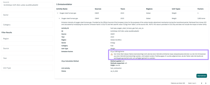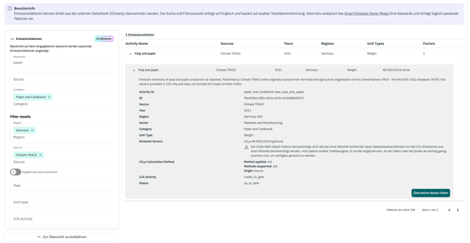 Wenn Sie einen passenden Faktor gefunden haben, können Sie sowohl in der manuellen als auch in der KI-gestützten Suche diesen durch Klicken auf den Button Übernehme diesen Faktor in den Climate Hub übernehmen. Alle relevanten Infos, die für die Nachvollziehbarkeit wichtig sind, werden anschließend im Climate Hub angezeigt. Dort haben Sie auch die Möglichkeit der Aktivität einen eigenen Namen (Art) zu geben.