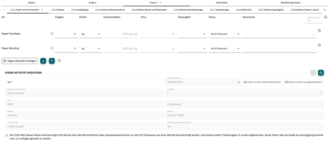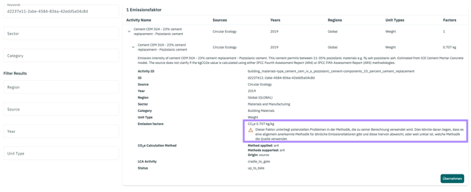 Die Nutzung der KI-gestützten Emissionsfaktorensuche kann zu ungenauen oder unvollständigen Ergebnissen führen, insbesondere wenn Bezeichnungen unsauber oder mehrdeutig sind. Zudem können regionale Unterschiede oder neuere Datenquellen unberücksichtigt bleiben. Daher sollten alle KI-Vorschläge sorgfältig geprüft werden, bevor sie für Berichte oder Entscheidungen genutzt werden. Die Verantwortung für die finale Auswahl des Emissionsfaktors liegt stets bei den Anwender:innen. - Beschreibung zur Datenqualität: