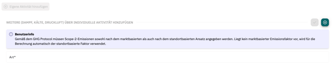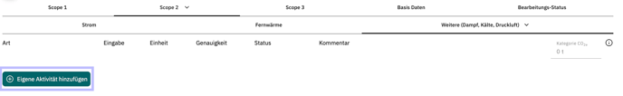 Klicken Sie auf "+ Eigene Aktivität hinzufügen", um Ihren Verbrauch von Dampf, Wärme und Druckluft einzugeben. Es öffnet sich eine Eingabemaske, in der Sie die Angaben Schritt für Schritt erfassen: