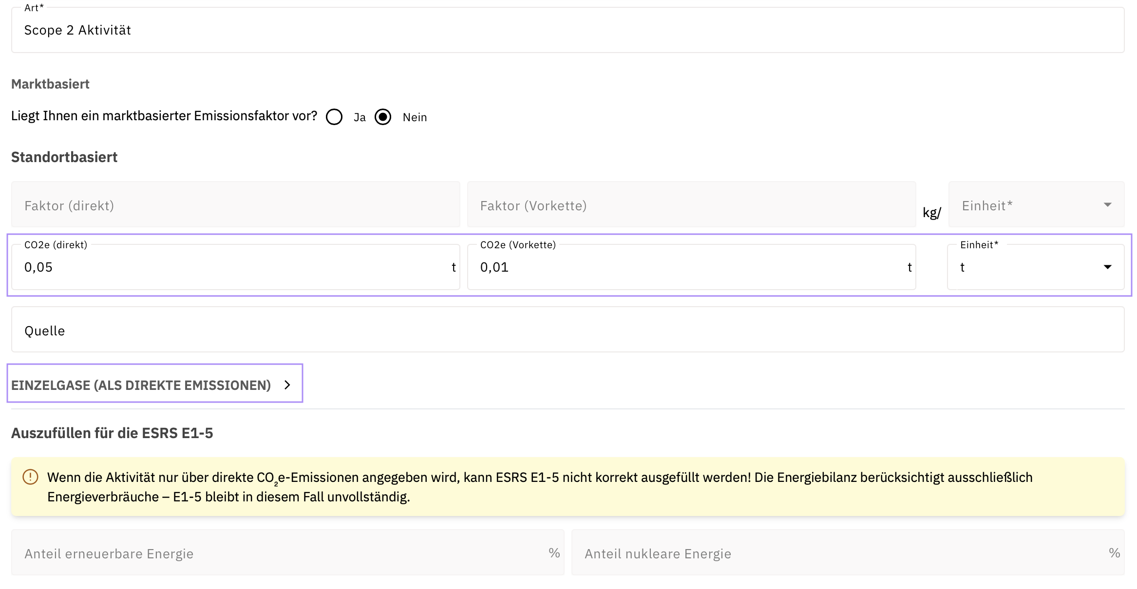 Eingabe von direkten CO2e Emissionen in Scope 2