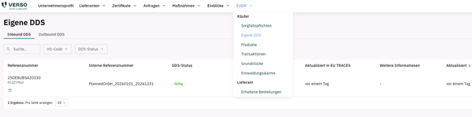 Wir haben einen neuen Menüpunkt „Eigene DDS“ hinzugefügt, um Ihnen den Zugriff auf die Sorgfaltspflichtenerklärungen (DDS) Ihres Unternehmens zu erleichtern:- Eingehende DDS: DDS, die von Importeuren auf der Grundlage der Geodaten ihrer Lieferanten erstellt wurden.