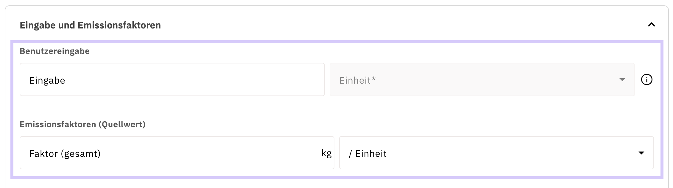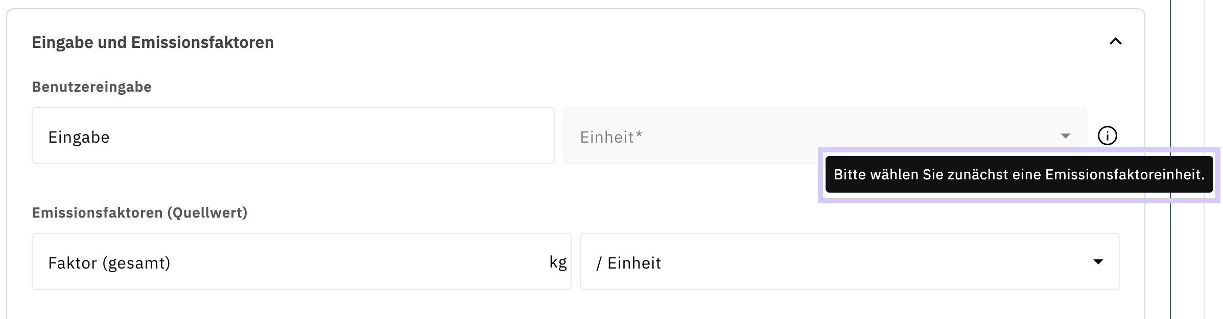 Die Auswahl der Einheit folgt der bestehenden Logik: Das Eingabeeinheit-Dropdown ist erst nach Auswahl einer Emissionsfaktoreinheit aktiv und zeigt anschließend nur passende Einheiten desselben Einheitentyps an.