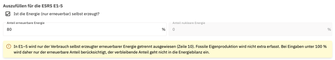 Wenn das Kontrollkästchen „Selbst erzeugte Energie“ aktiviert wird, erscheint die folgende Warnung, falls der Anteil erneuerbarer Energie von 100 % auf einen niedrigeren Wert angepasst wird:
