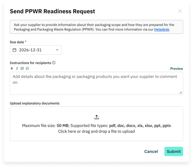 Sobald Sie alle oben beschriebenen Schritte abgeschlossen und nach Klick auf „Anfrage senden“ den Anfragetyp „PPWR Readiness“ ausgewählt haben, gehen Sie wie folgt vor, um die Anfrage zu übermitteln und an Ihre Lieferanten zu senden: