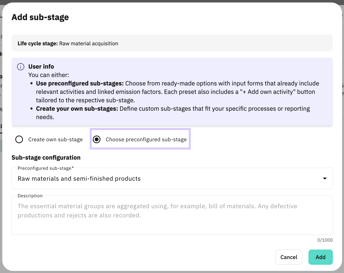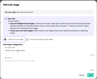 Sub-stages at level 1 define the main structure within a life cycle stage. Either preconfigured sub-stages can be used, which already contain predefined activities and associated emission factors. This is particularly helpful at the beginning of data collection. Alternatively, individual sub-stages can be used, which can be freely named and map company-specific process steps.