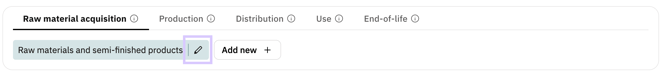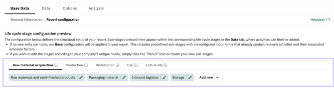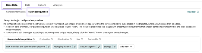 With the report configuration, the structural setup of a Product Carbon Footprint can be flexibly adapted to the company’s real processes. The defined sub-stages determine where activities are entered in the Data tab and how they are displayed in the Analysis section.