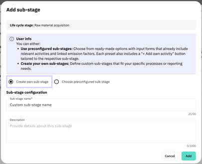 The configuration of sub-stages takes place in the Base data section of the PCF report. There, it can be defined which sub-stages should exist within each life cycle stage. This structure is automatically transferred to the Data tab and forms the basis for entering activities.