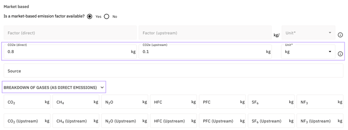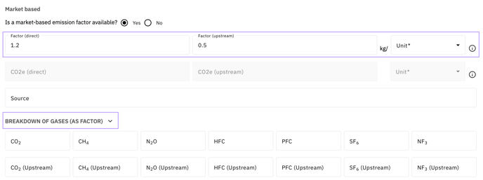Note: If you previously selected "Yes" when asked about a market-based emission factor, the dropdown menu in this section is disabled and automatically adopts the unit from the market-based section.