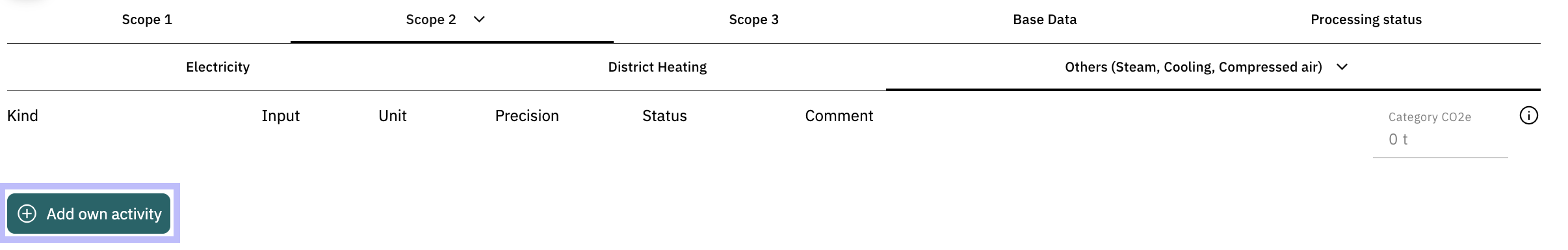 Click on "+ Add own activity" to enter your steam, heat and compressed air consumption. This will open an input mask where you can enter the information step by step: