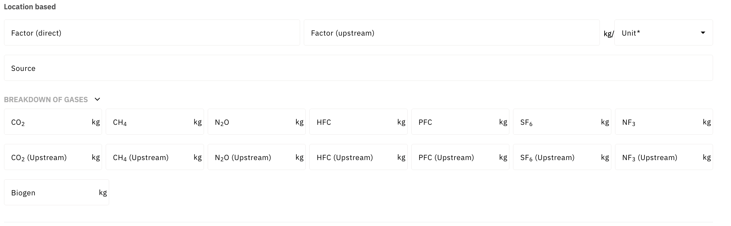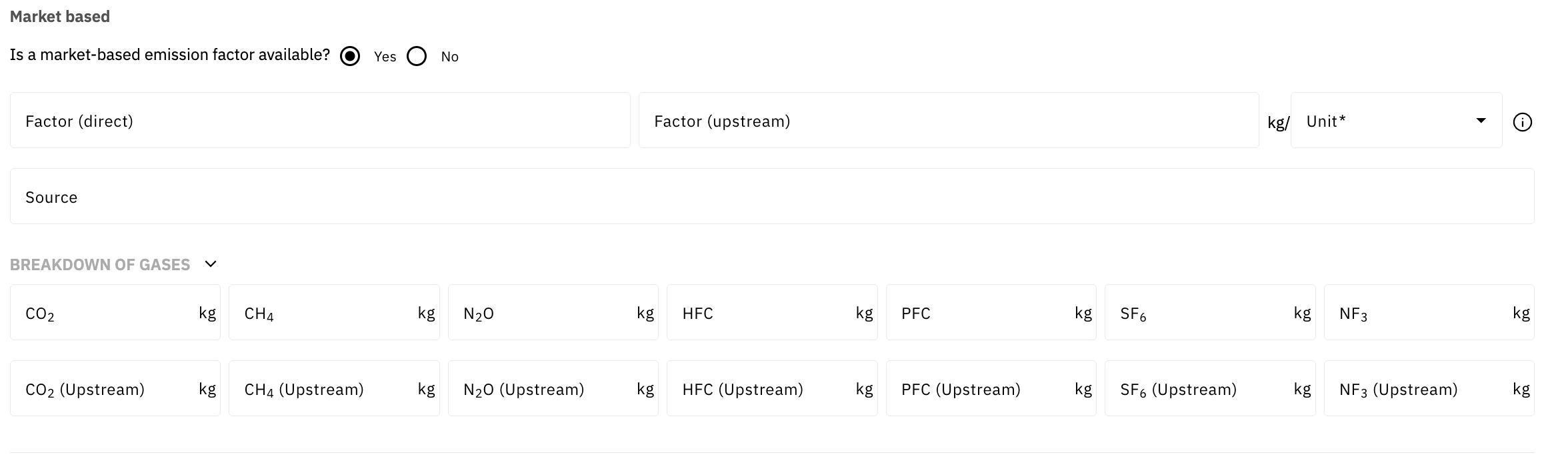 Note: If you previously selected "Yes" when asked about a market-based emission factor, the dropdown menu in this section is disabled and automatically adopts the unit from the market-based section.