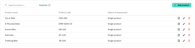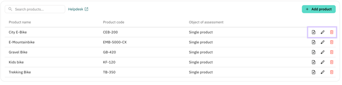 Existing entries in the product list can be managed using the icons at the end of each product row: