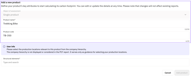 A new page opens where you can enter the product name and, if available, a product code. The Object of assessment field is currently greyed out and set to a single product. In future, you will also be able to specify an entire range or product line here.