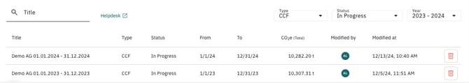 To search for specific reports, you can use the three filters: Type, Status and Year. The Type filter allows you to search for Corporate Carbon Footprint (CCF), Event Carbon Footprint (ECF) or Product Carbon Footprint (PCF) reports. With the Status filter, you can search for reports that are In Progress, In Review, Finished or Published. The Year filter allows you to narrow down the reporting period by either double-clicking on a year in the annual overview or selecting two different years. Once the filters have been set, only reports that match the selected criteria will be displayed.