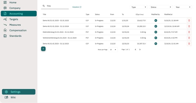 In the Accounting tab in the left navigation bar, you can create new reports for calculating the emissions of a PCF and view and edit existing reports.