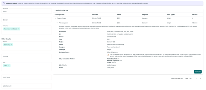 Once you have found a suitable factor, you can transfer it to the Climate Hub by clicking on the add factor button. All relevant information that is important for traceability is then displayed in the Climate Hub. There you also have the option of giving the activity its own name (kind).