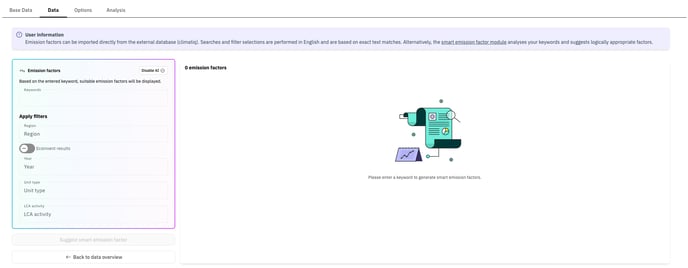 The AI-powered emission factor search accesses all databases available through the external Climatiq database. A list of these databases can be found here, and full documentation of the interface is available here.Risks when using the AI function