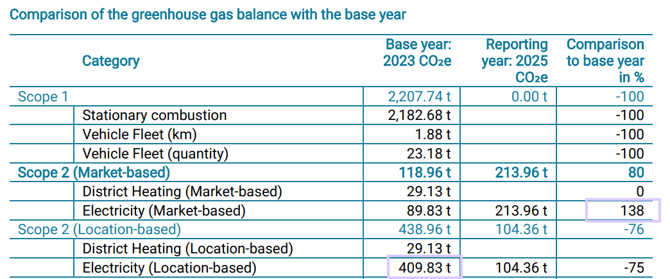 - The base year value for “Electricity (Location-based)” was displayed incorrectly, as the market-based value was shown instead of the location-based value. However, the percentage comparison between base year and reporting year was calculated correctly in this case.