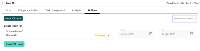 In both CCF and PCF reports, you can now view the emission factor version used in the report under the Options tab. This version applies only to the predefined emission factors available in the Climate Hub.