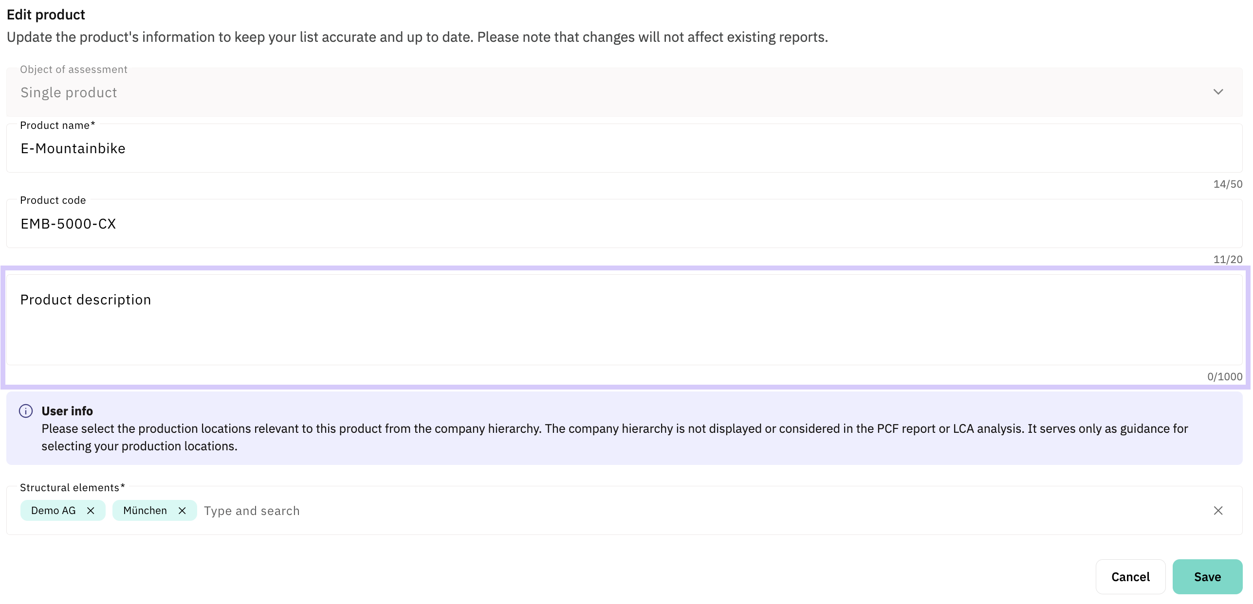 From now on, a product description can be maintained directly in the product list. When creating a new PCF report, this description is automatically transferred to the base data. Existing reports remain unchanged, even if the product description is updated later.