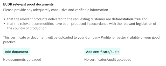 - In the second section of the EUDR profile, you can provide your supporting documents that are conclusive and verifiable: