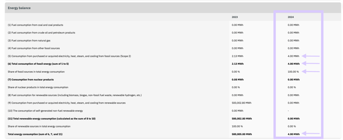 When entering 0% renewable and 0% nuclear energy shares in Scope 2 activities (Electricity – custom activity, District heating, Others), the energy data was previously only reflected in the row "Total energy consumption (sum of 6, 7, and 11)" of the E1-5 table. This calculation has now been corrected so that fossil energy shares are fully and accurately captured in all relevant rows across all three categories.